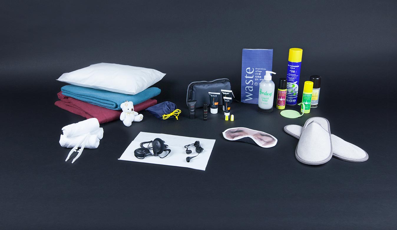 An extensive range of items enhance the onboard experience of your passengers, including hot towels, pillows, blankets, amenity kits, airsickness bags, headrest covers, soap, air fresheners, insecticide.