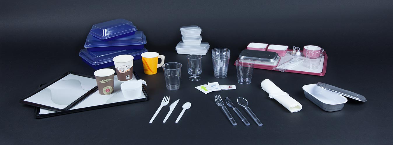 A complete selection of disposable and rotable serving items for Economy class. Glasses, cups, cutlery packs, lunch boxes, dishes, aluminum casseroles, condiments, oven bags, waste bags, traymats, rotable trays and rotable tray set-ups.