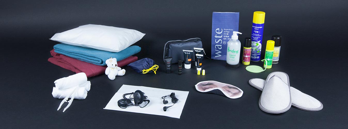 An extensive range of items enhance the onboard experience of your passengers, including hot towels, pillows, blankets, amenity kits, airsickness bags, headrest covers, soap, air fresheners, insecticide.